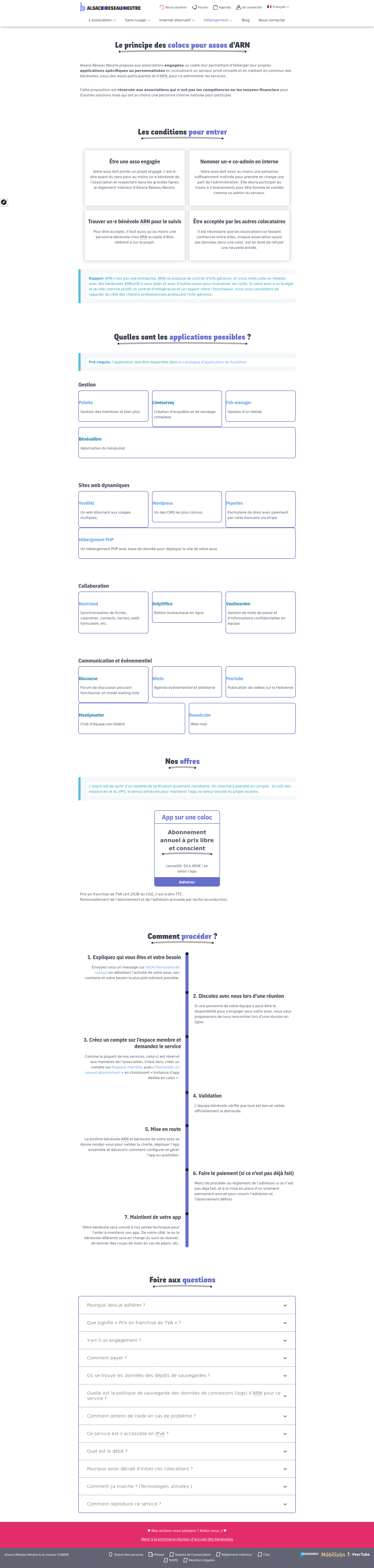 - A priori les projets hĂ©bergĂ©s sur le VPS de coloc sont portĂ©s par des personnes situĂ©es Ă Strasbourg et alentours, ou a minima Ă proximitĂ© dâun membre active dâARN, afin de permettre des rencontres physiques pour des Ă©changes productifs qui augmentent les compĂ©tences techniques globales de ARN.