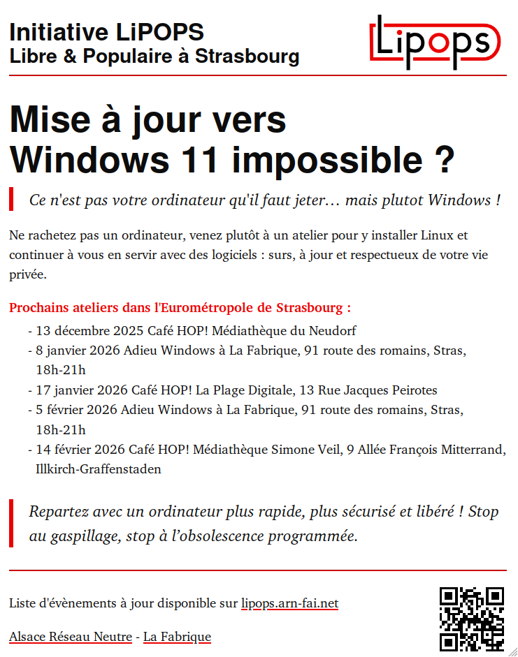 - La Fabrique se lance dans des ateliers Adieu Windows (voir le sujet Orga d’un évènement Adieu Windows à La Fabrique)